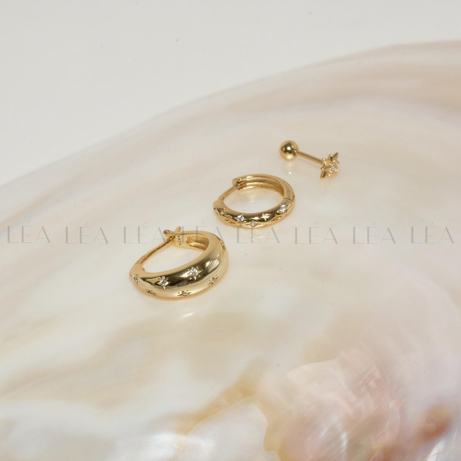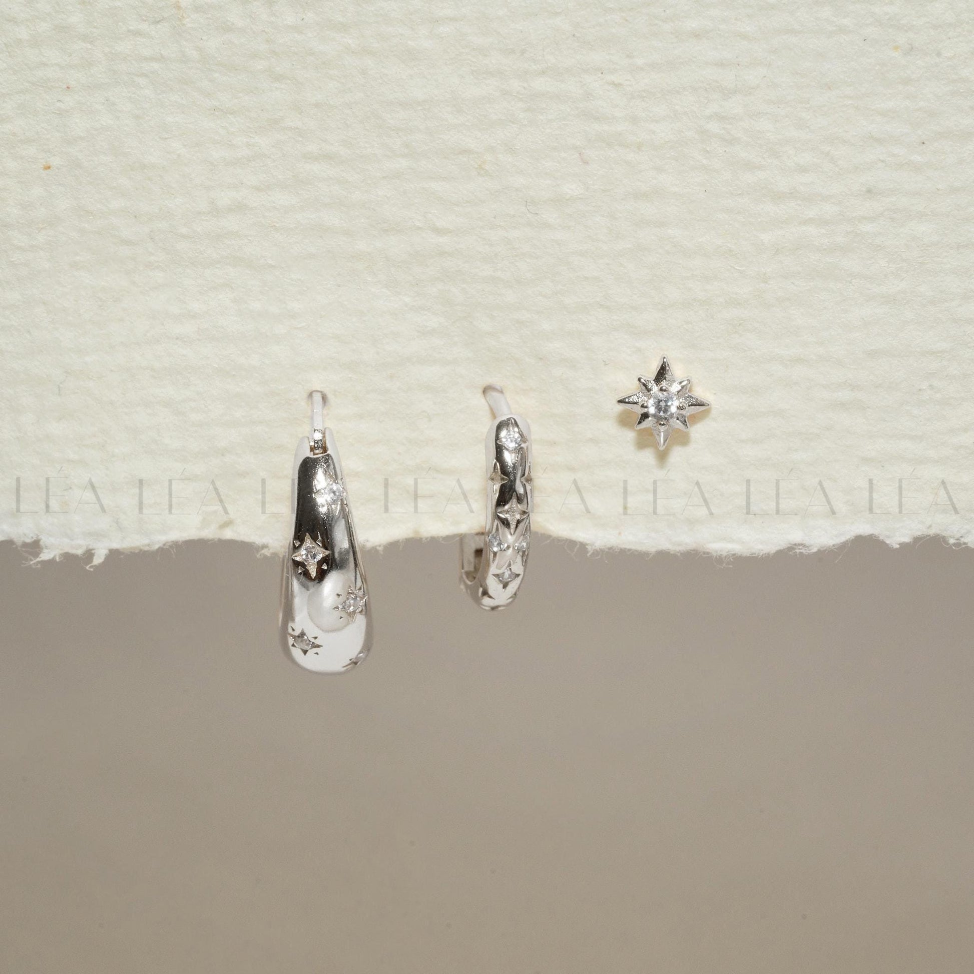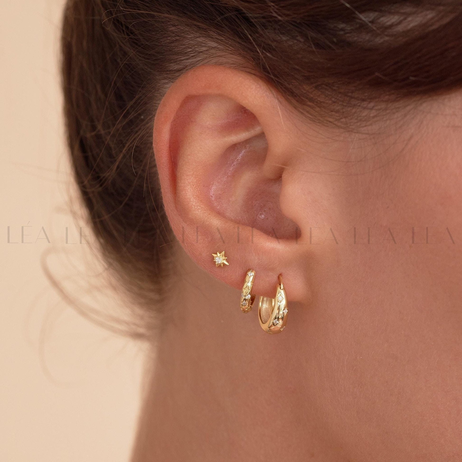 Enhance your style with our 18K Gold Earring Set, featuring three elegant designs perfect for any occasion. This set includes a tapered earring with CZ stars, a delicate starburst huggie hoop, and a dainty star stud, all crafted in luxurious gold. Each piece adds a touch of sophistication and versatility to your jewellery collection, making it an ideal gift or a chic addition to your own look. Whether worn together or separately, these earrings bring effortless elegance to any outfit.