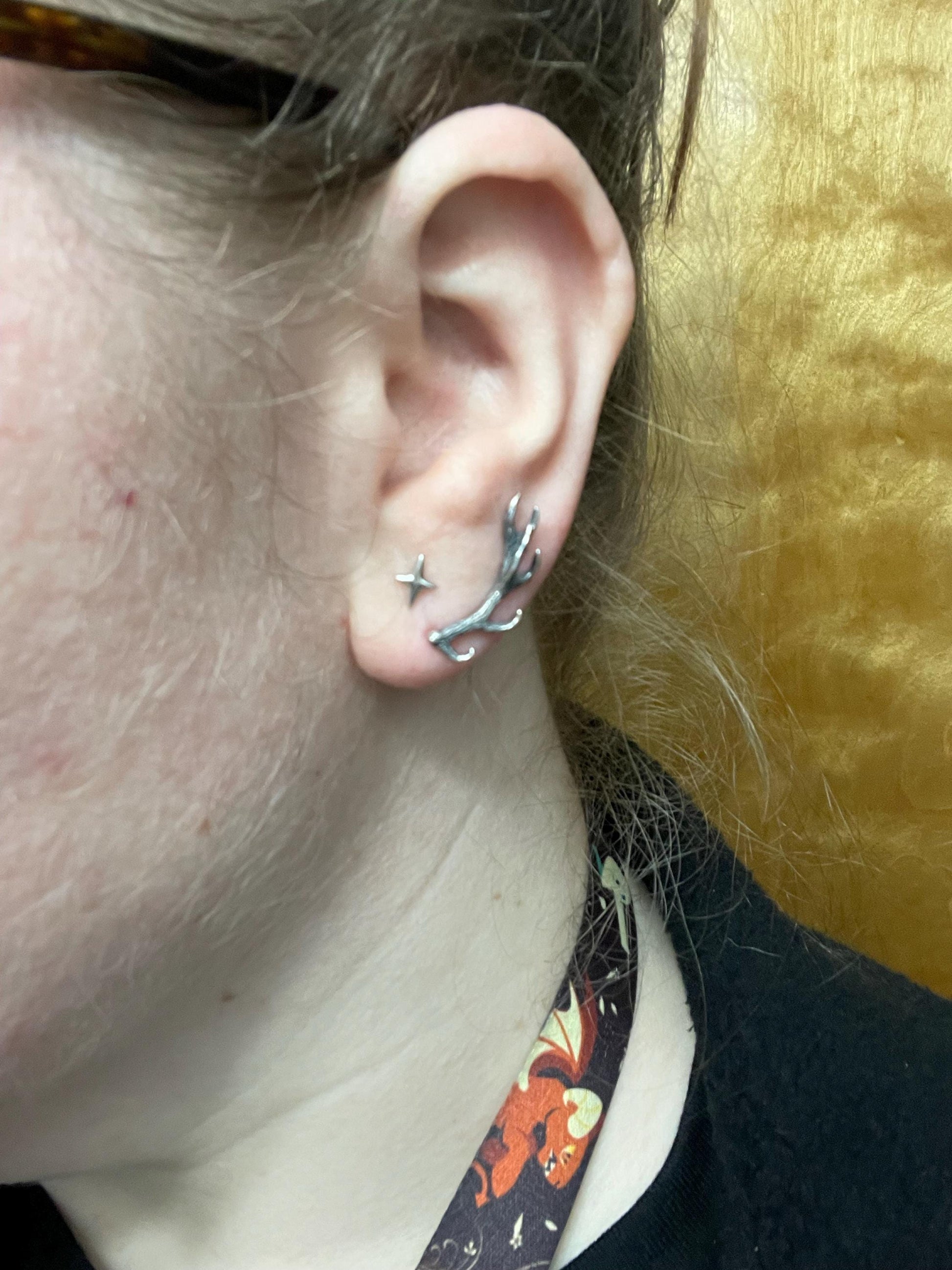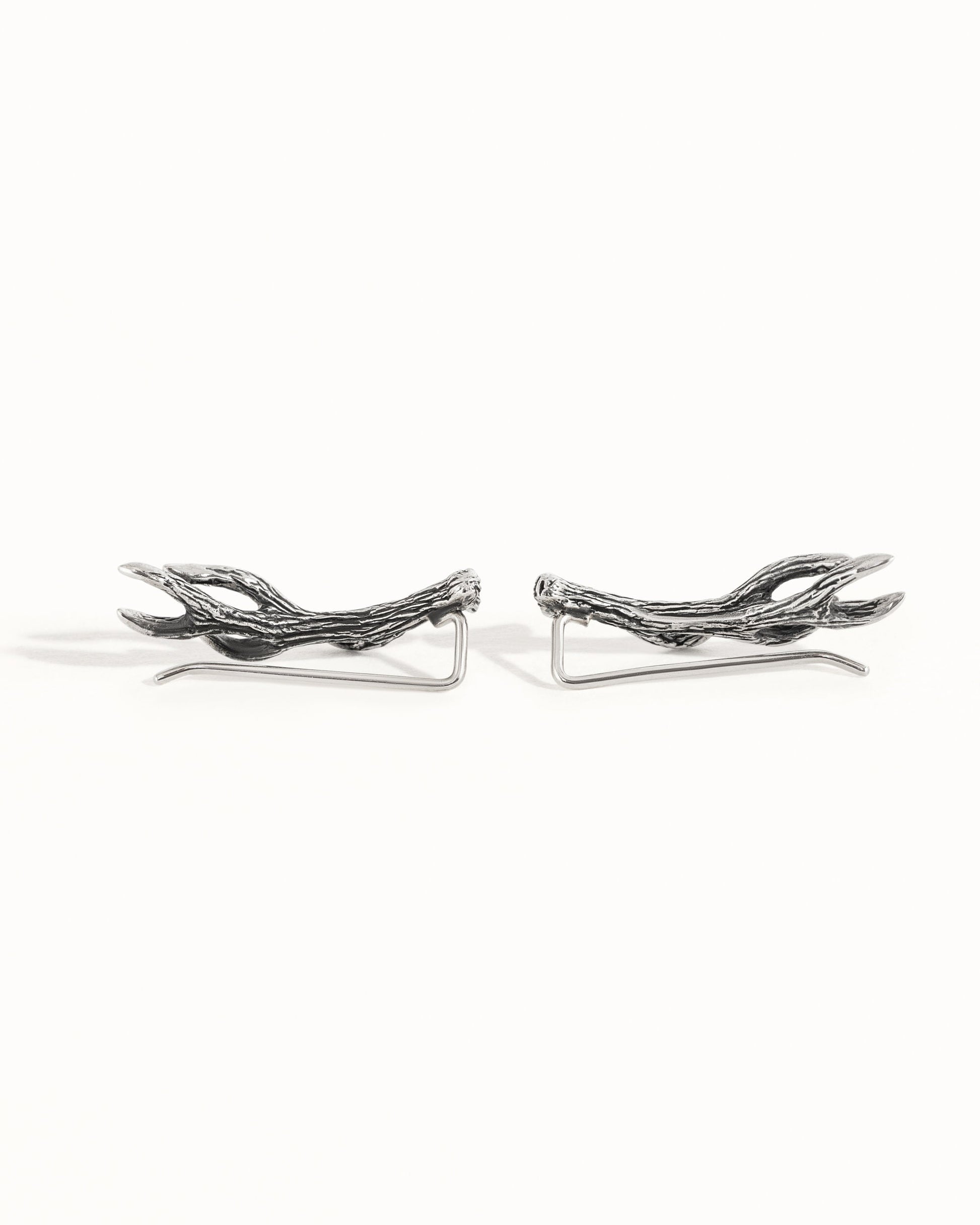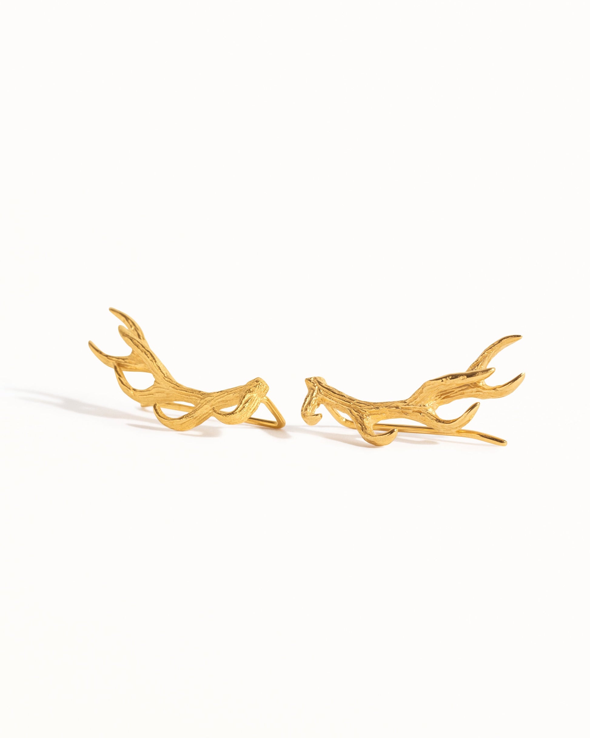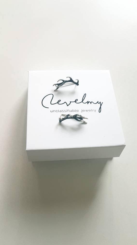 Antler Deer Horns Ear Cuff cast in solid Sterling Silver. The earring has been lovely carved inspired by wild deer style. The Earring measures 7/8" (22mm) long. This design is available in two styles: Oxidized Sterling Silver and shiny Yellow Gold plated.