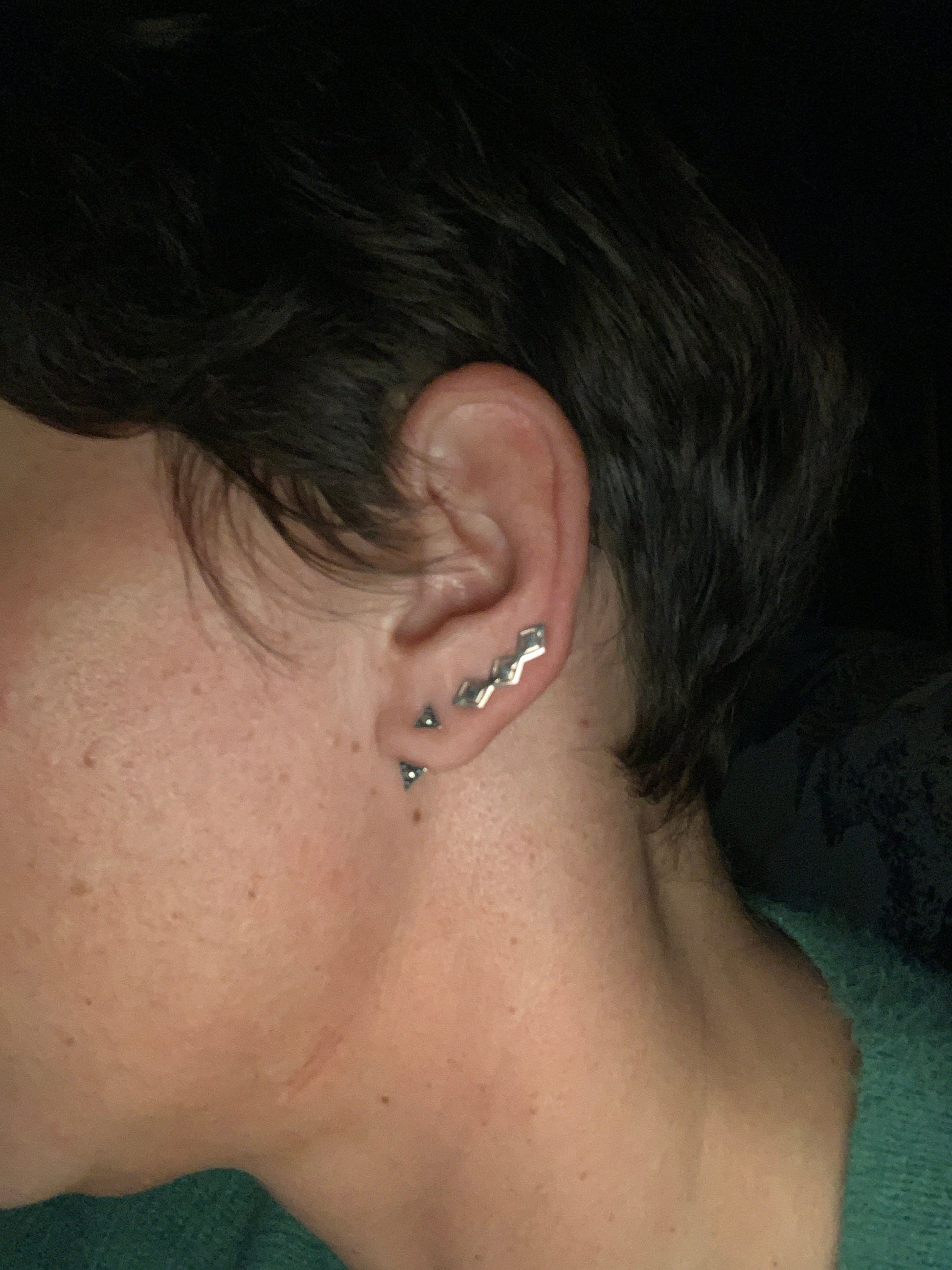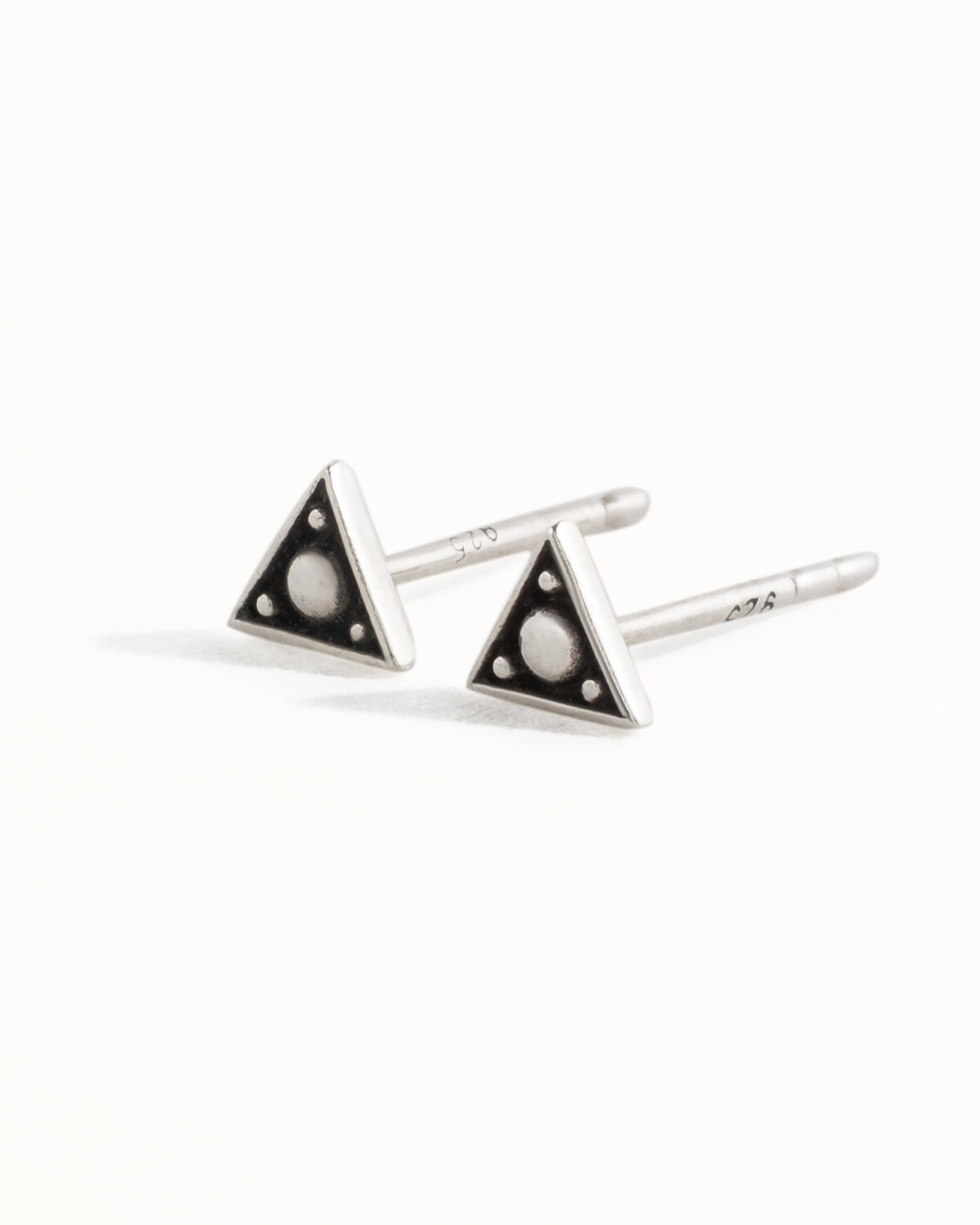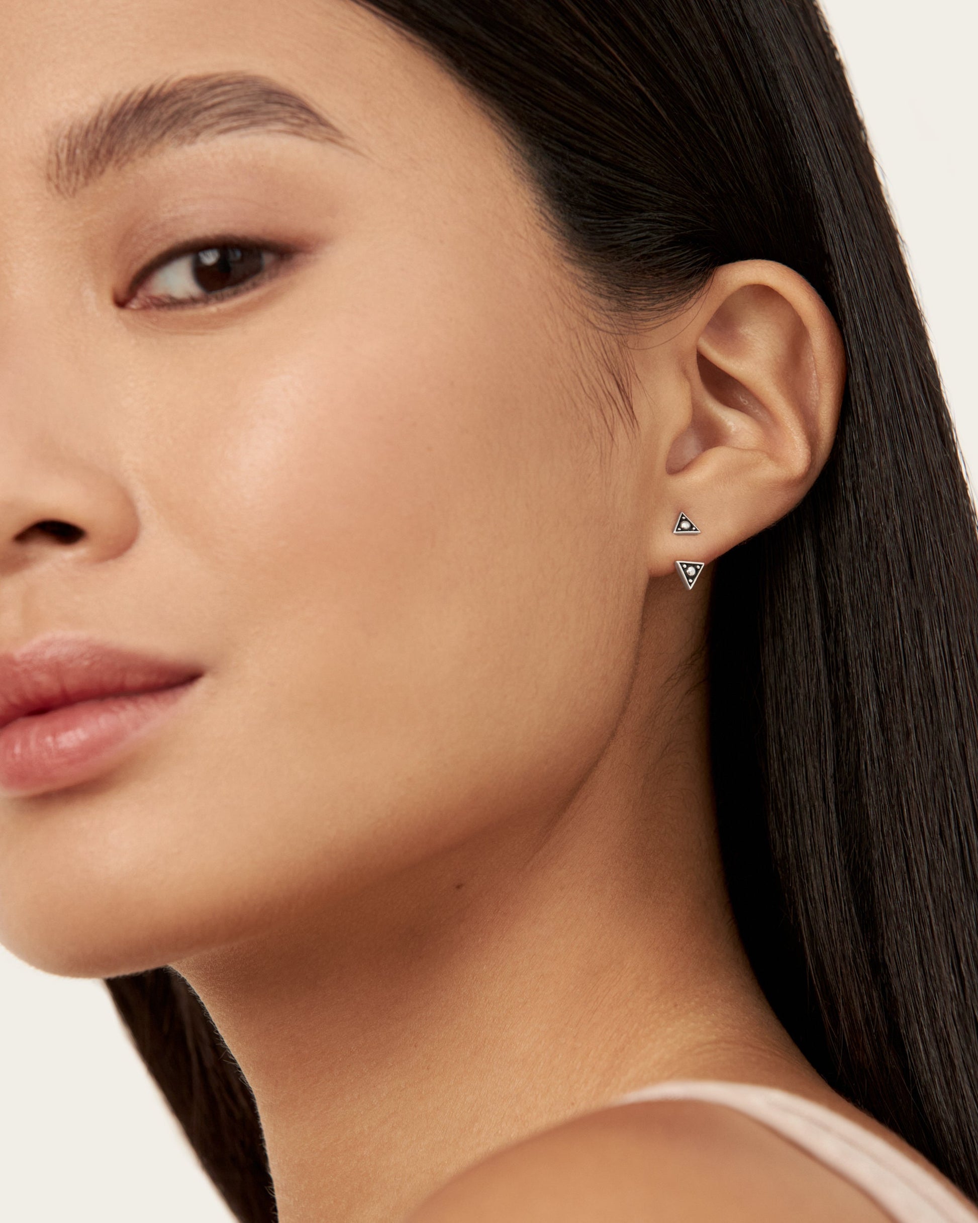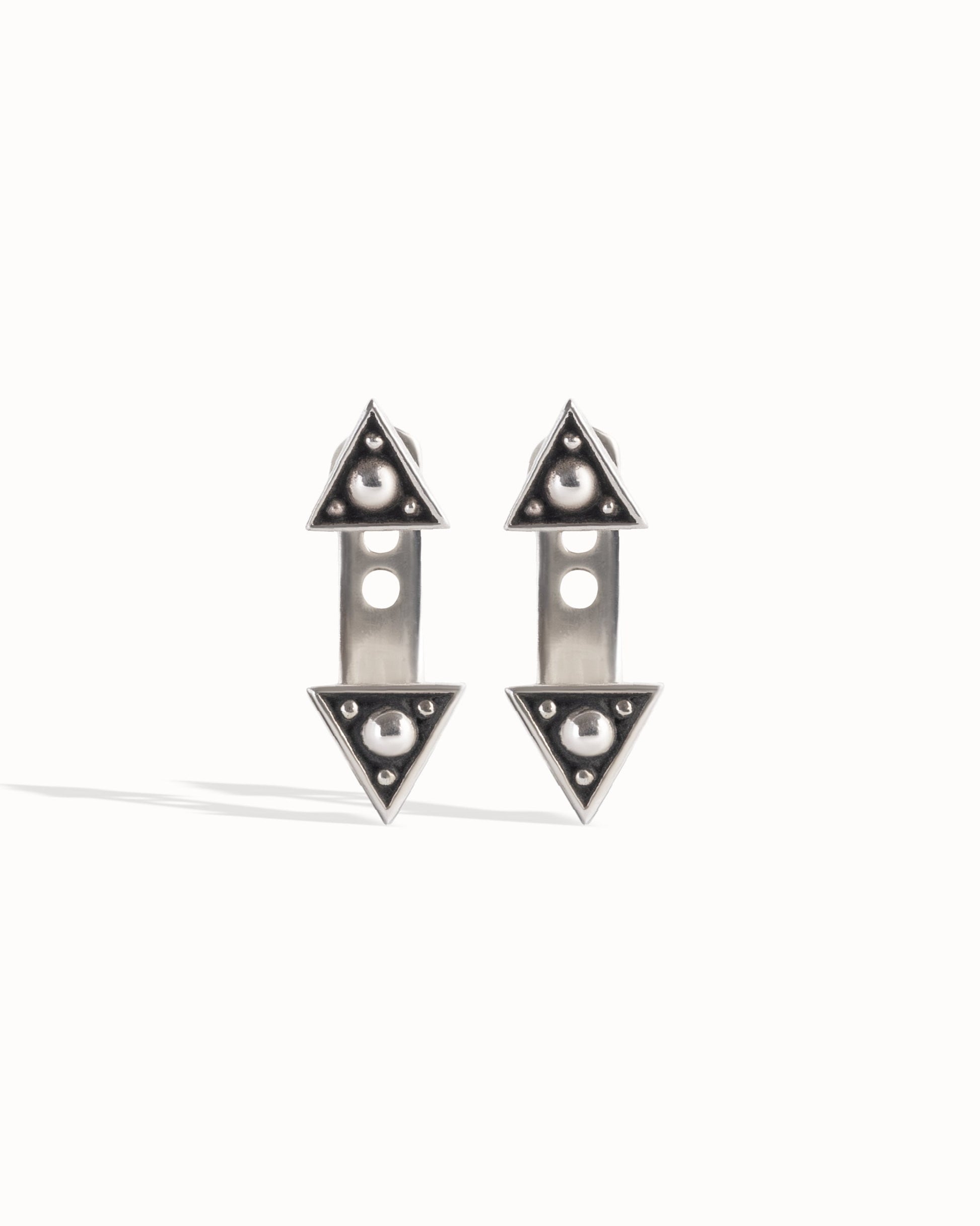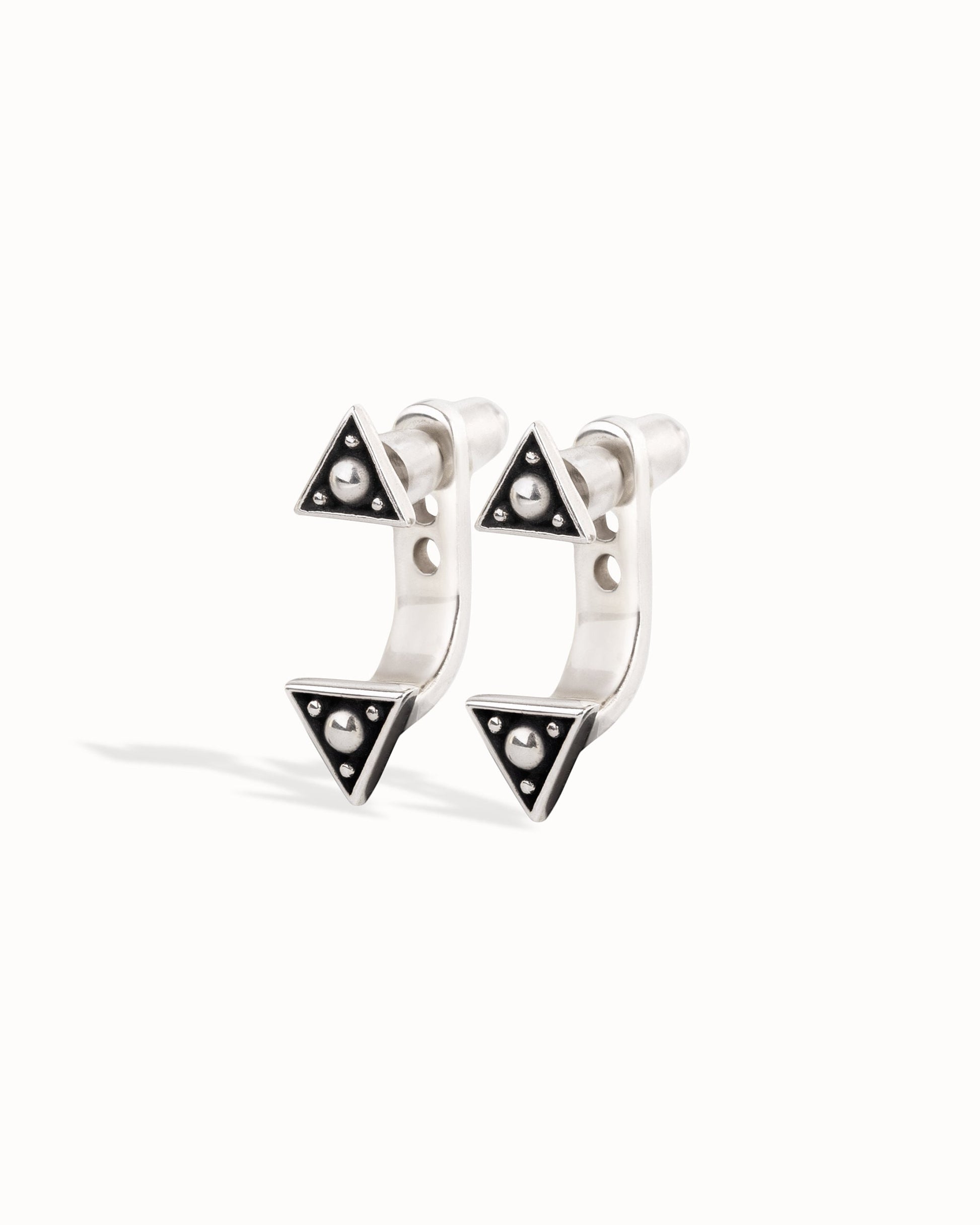 Triangle ear jacket earrings cast in solid Sterling Silver 925, finish with black oxide and hand shiny polish. The Earring measures 9/16" (14mm) long. Triangle stud earrings can also be worn separately.