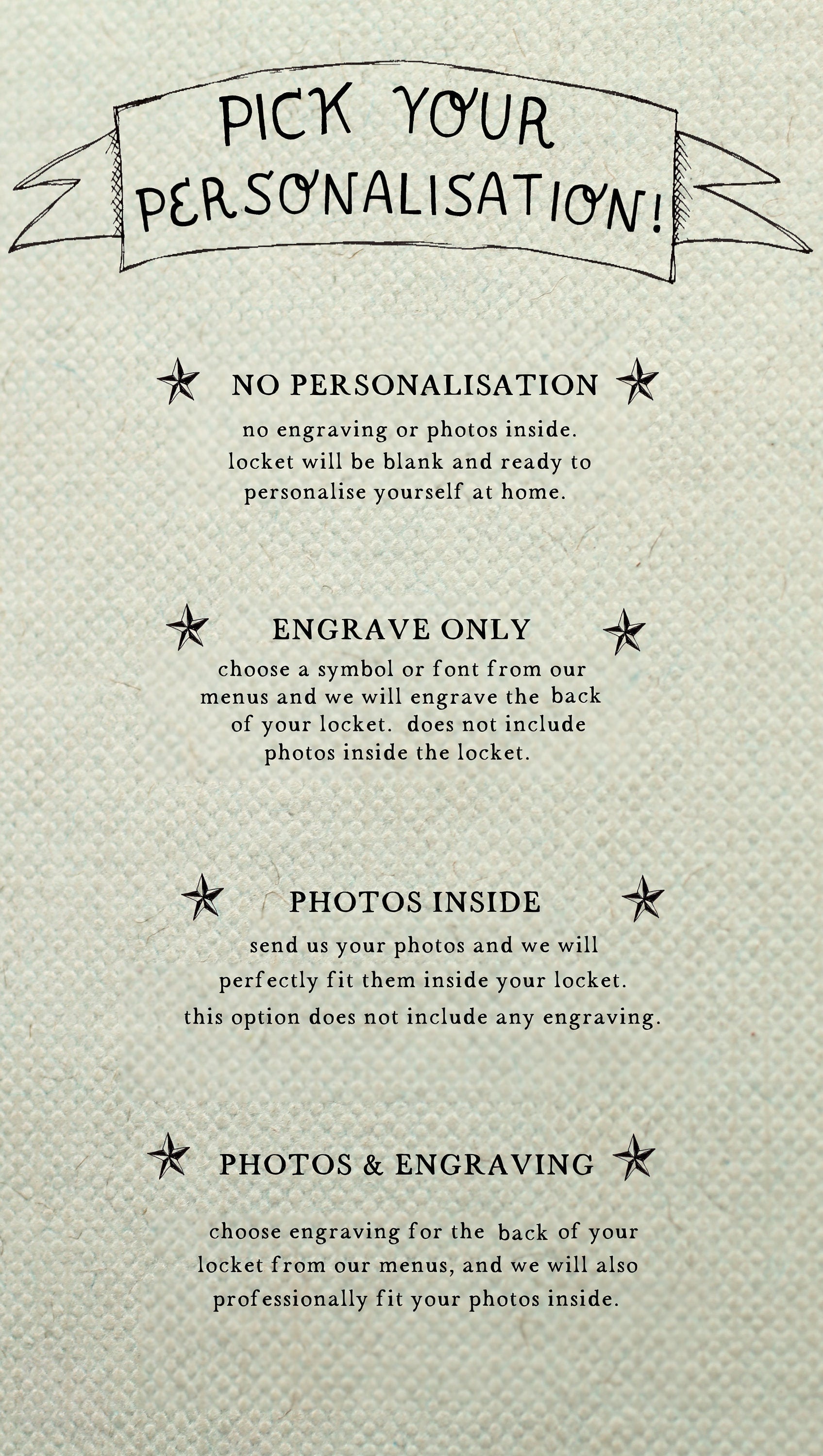 Our lockets are made to order and we offer a range of different chain lengths. Please refer to our illustration for a better idea of how necklace lengths will look when worn.