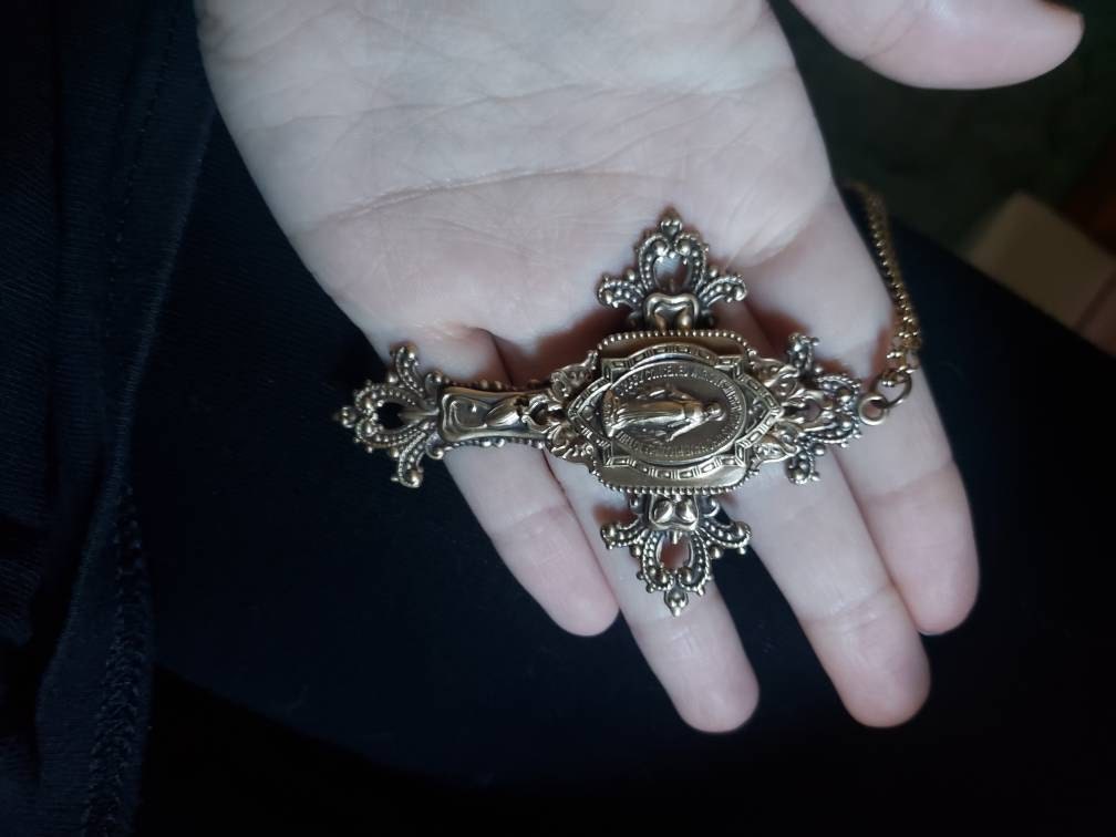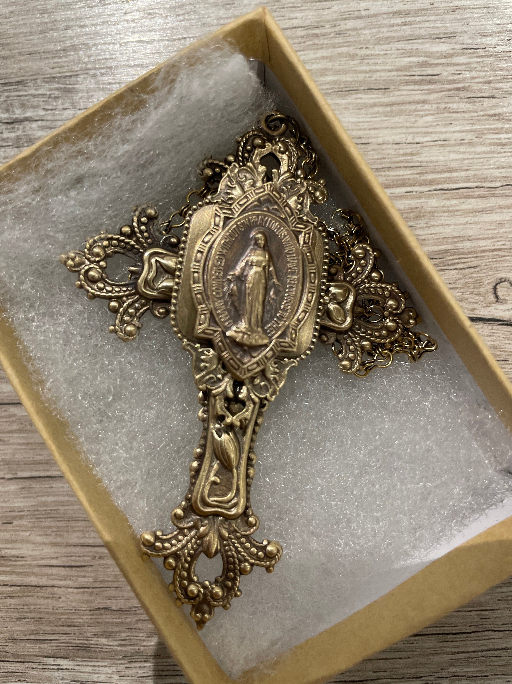 This is such a gorgeous vintage piece. An extraordinary large layered cross. A lovely metal of Mother Mary. Exquisite detail with a rich patina. The pendant hangs from a lovely vintage ladder chain.