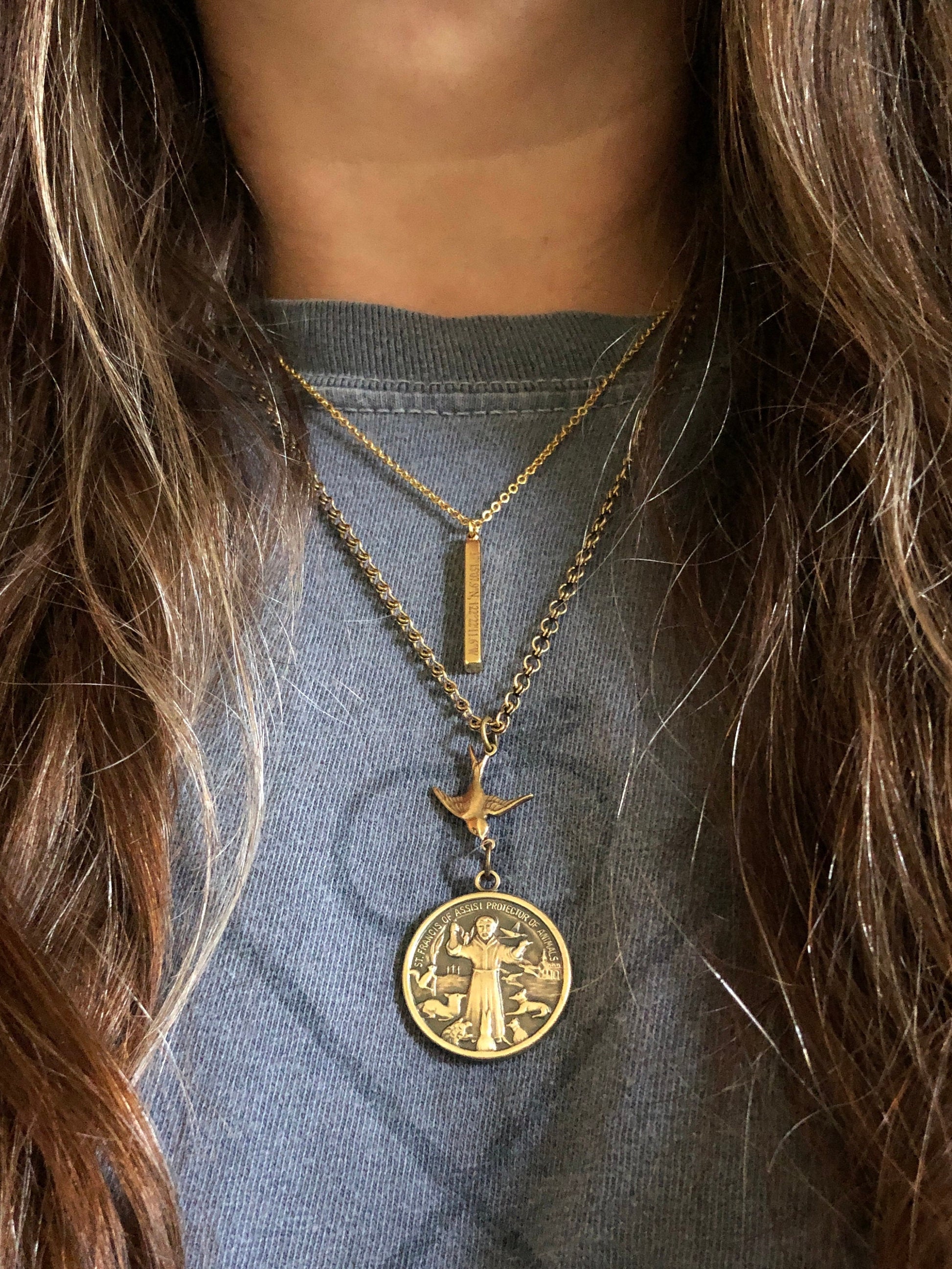 This is such a beautiful vintage necklace. Vintage brass highly detailed image of St. Francis surrounded by animals. Exquisite detail with a rich patina. It's solid brass with a flat back that can be engraved. The pendant hangs from a beautiful vintage ladder chain.