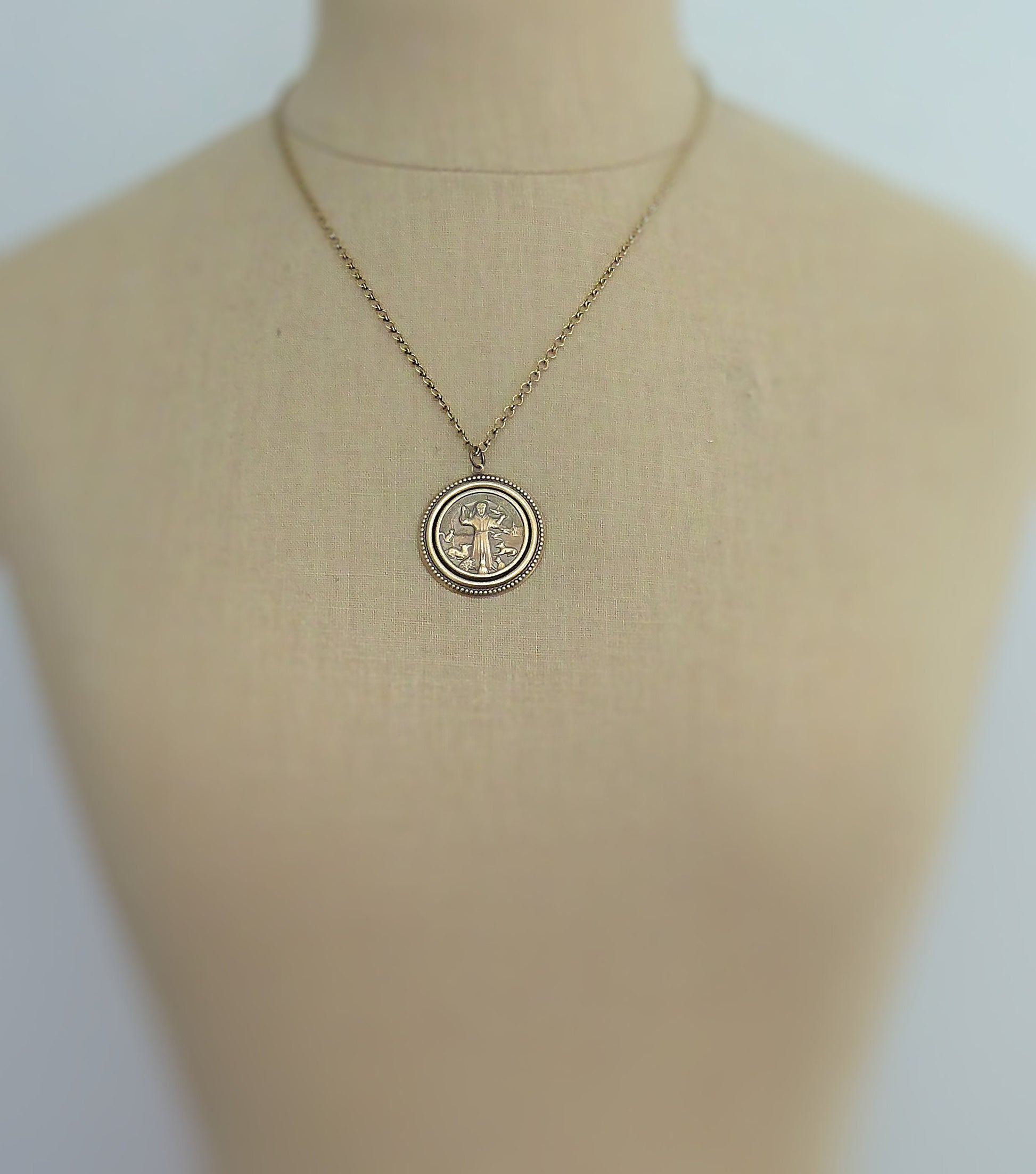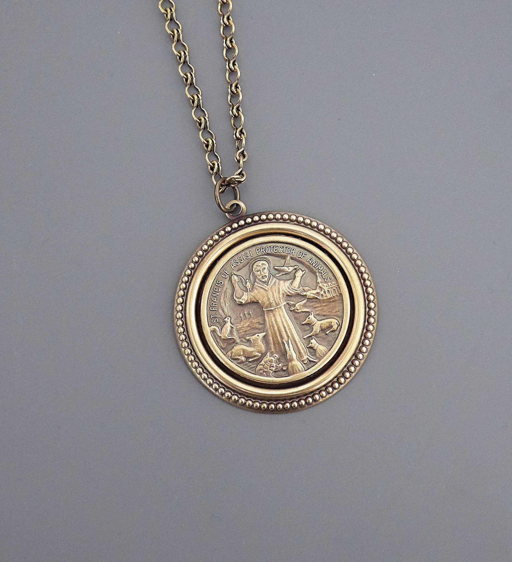 This is such a beautiful vintage necklace. Vintage brass highly detailed image of St. Francis surrounded by animals. Exquisite detail with a rich patina. The solid brass pendant hangs from a beautiful vintage ladder chain.