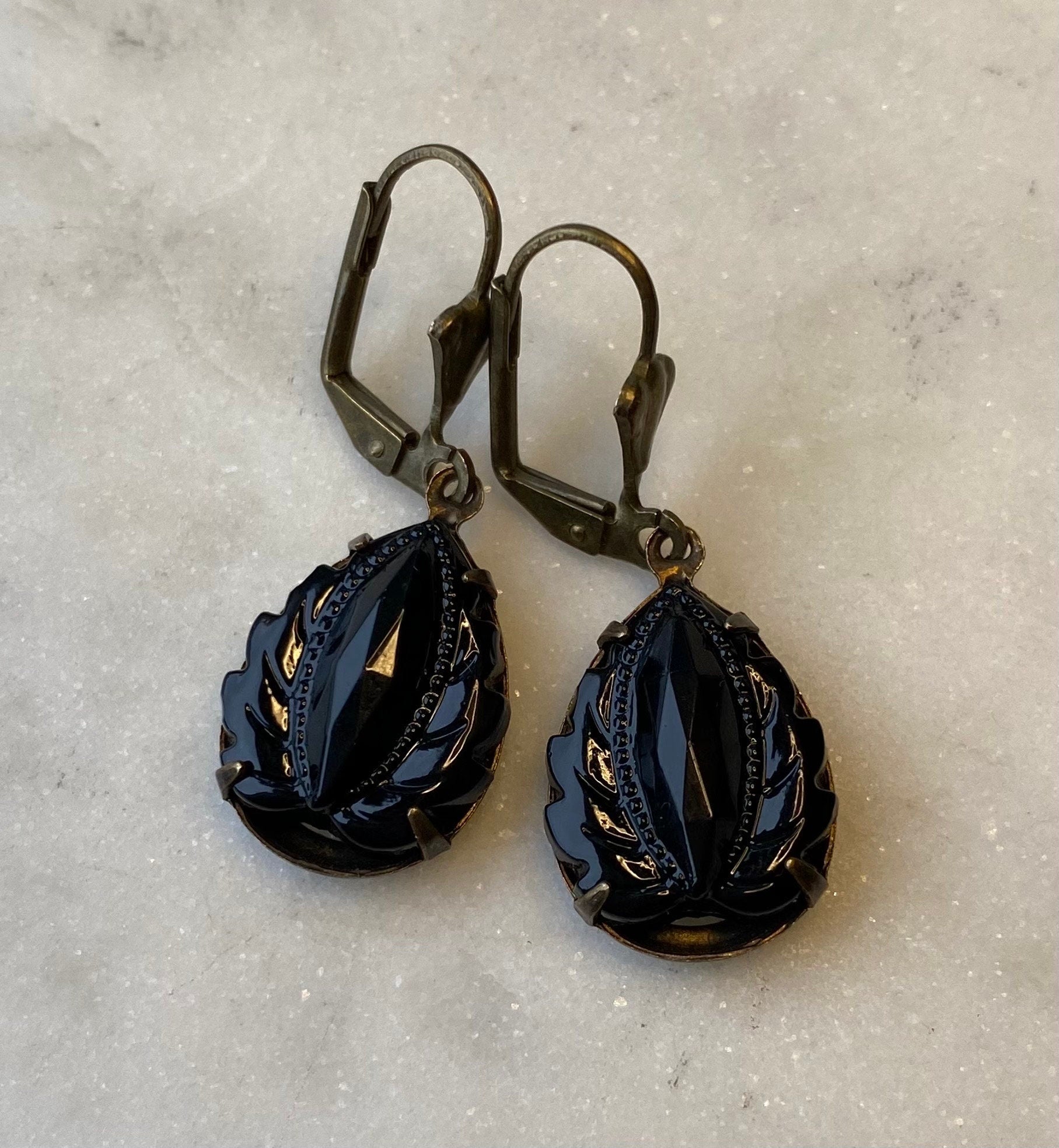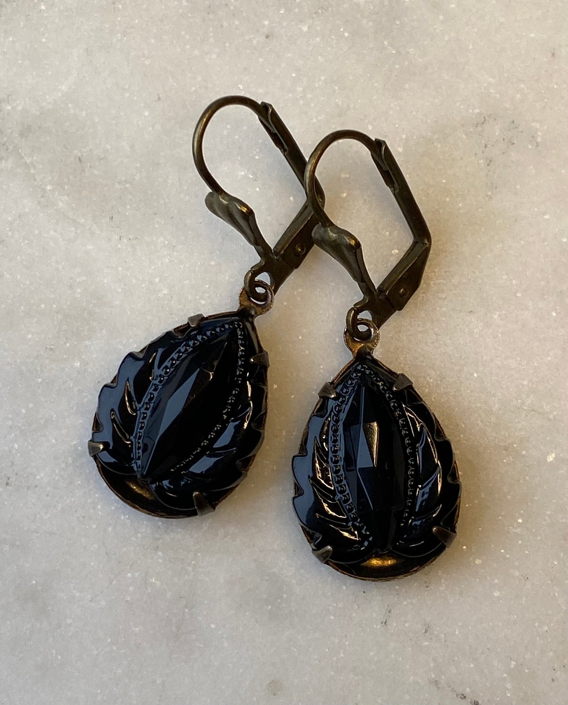 Vintage West German Jet Black Onyx Leaf 18 x 13 mm Faceted Glass Earrings