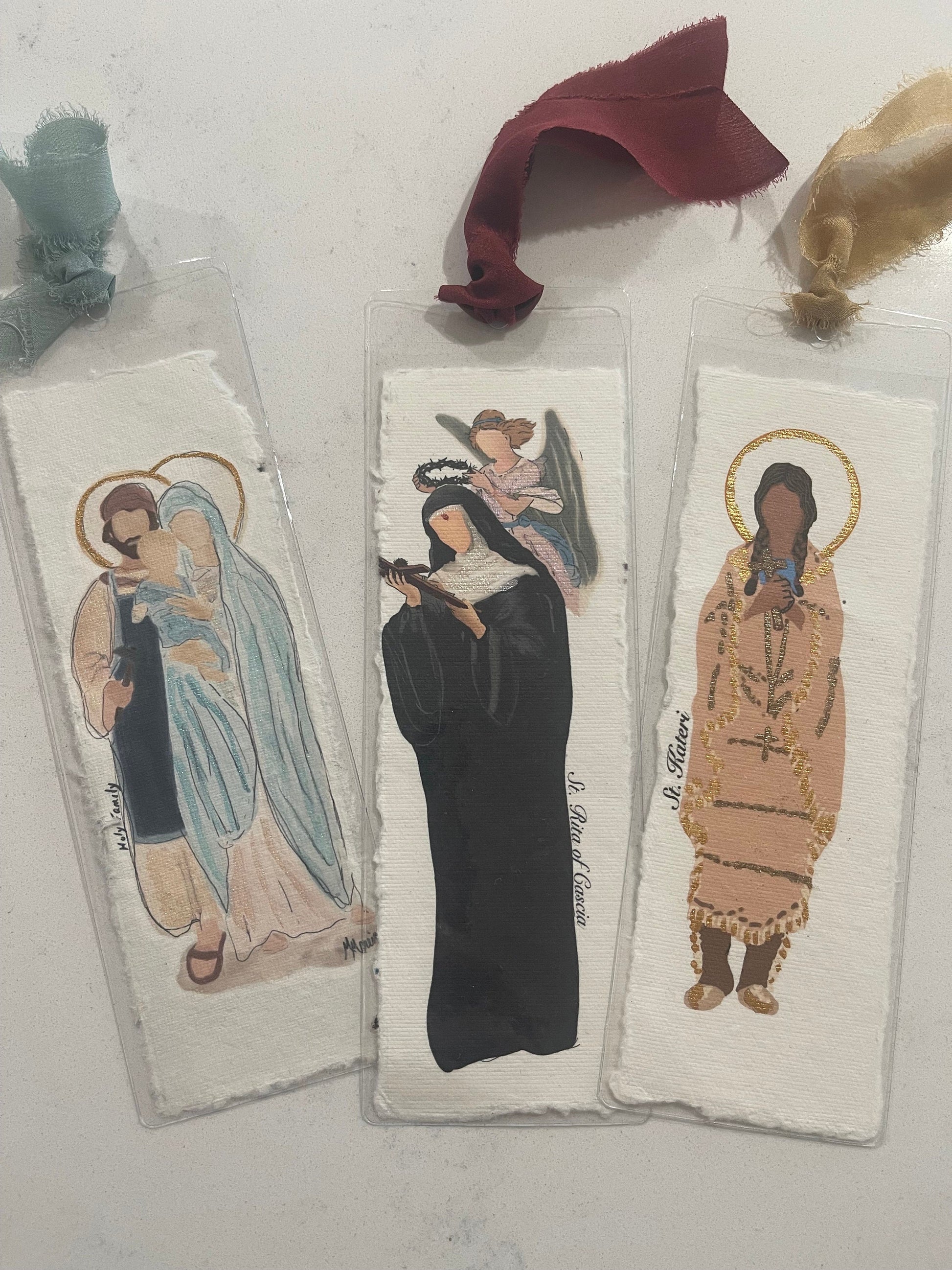 Deckled paper watercolor bookmark of your favorite saint or religious icon. we also have other listing for male and female saints bookmarks. Check them out.